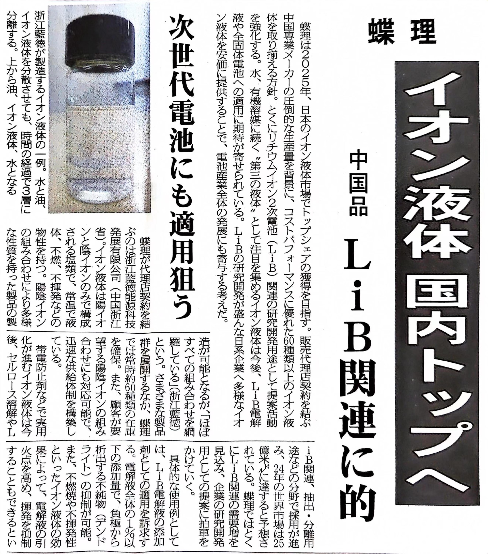 Trên Nhật báo Công nghiệp Hóa chất Nhật Bản vào ngày 10 tháng 7 năm 2023, nội dung liên quan của Công ty TNHH Phát triển Công nghệ Năng lượng Chiết Giang Ldet (sau đây gọi là "Ldet Technology") đã thu hút sự chú ý rộng rãi. Báo cáo này có tựa đề "Ứng dụng chất lỏng ion trong chất điện phân pin năng lượng mới" trình bày chi tiết các kết quả nghiên cứu quan trọng của Công nghệ Ldet trong lĩnh vực công nghệ năng lượng mới.