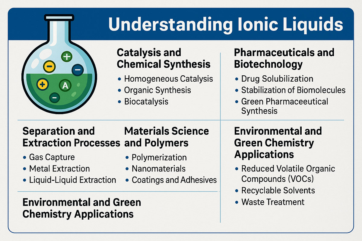 Chất lỏng ion đại diện cho một loại hóa chất linh hoạt, có thể điều chỉnh và cải tiến đang biến đổi các quy trình công nghiệp trên nhiều lĩnh vực. Từ xúc tác và điện hóa đến dược phẩm, khoa học vật liệu và kỹ thuật môi trường, các đặc tính độc đáo của chúng cho phép các công ty thiết kế các quy trình an toàn hơn, hiệu quả hơn và bền vững hơn.